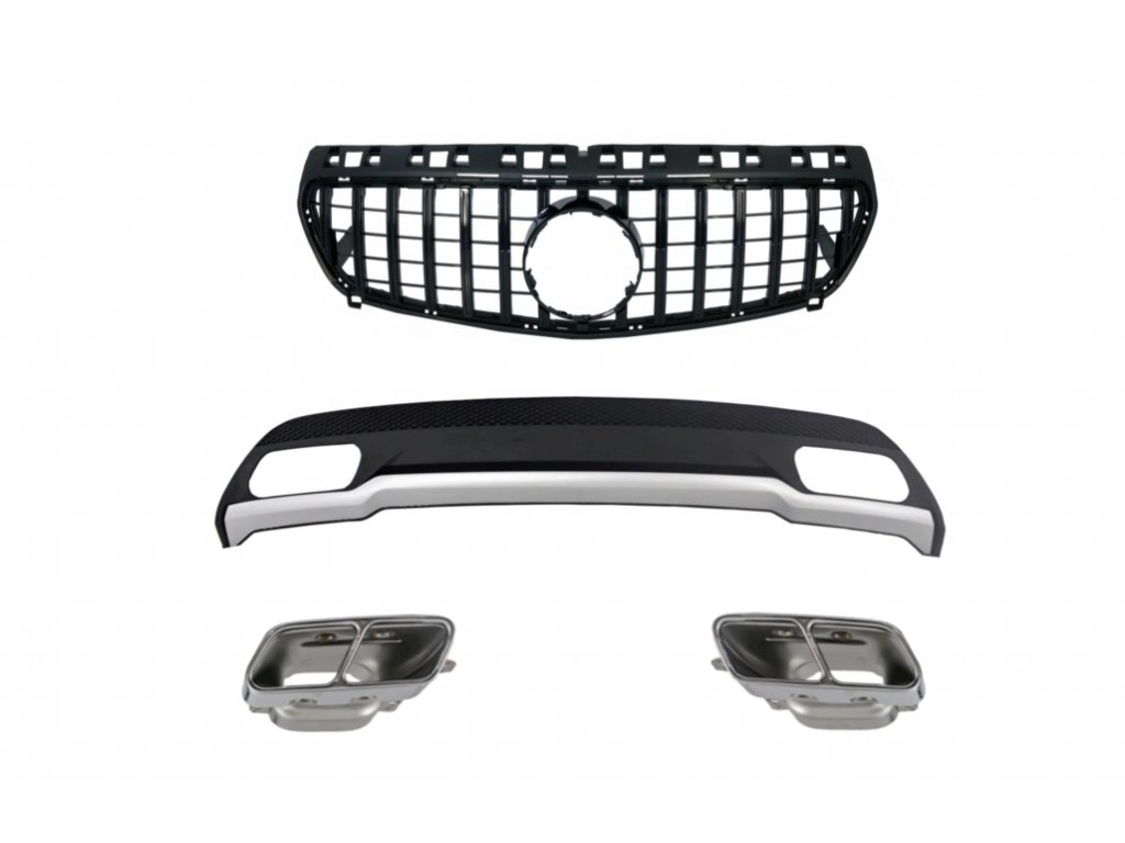 Air Diffuser with Exhaust Muffler Tips and GT-R Panamericana Grille All Black for Mercedes A-Class W176 (2012-08.2015) Sport Pack
