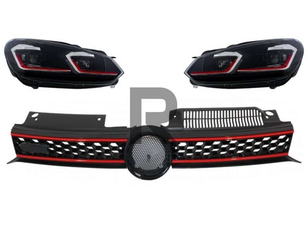 Centrálna mriežka prednej masky vhodná pre VW Golf 6 VI (2008-2012) s LED svetlometmi, plynulé dynamické sekvenčné smerové svetlá, dizajn GTI