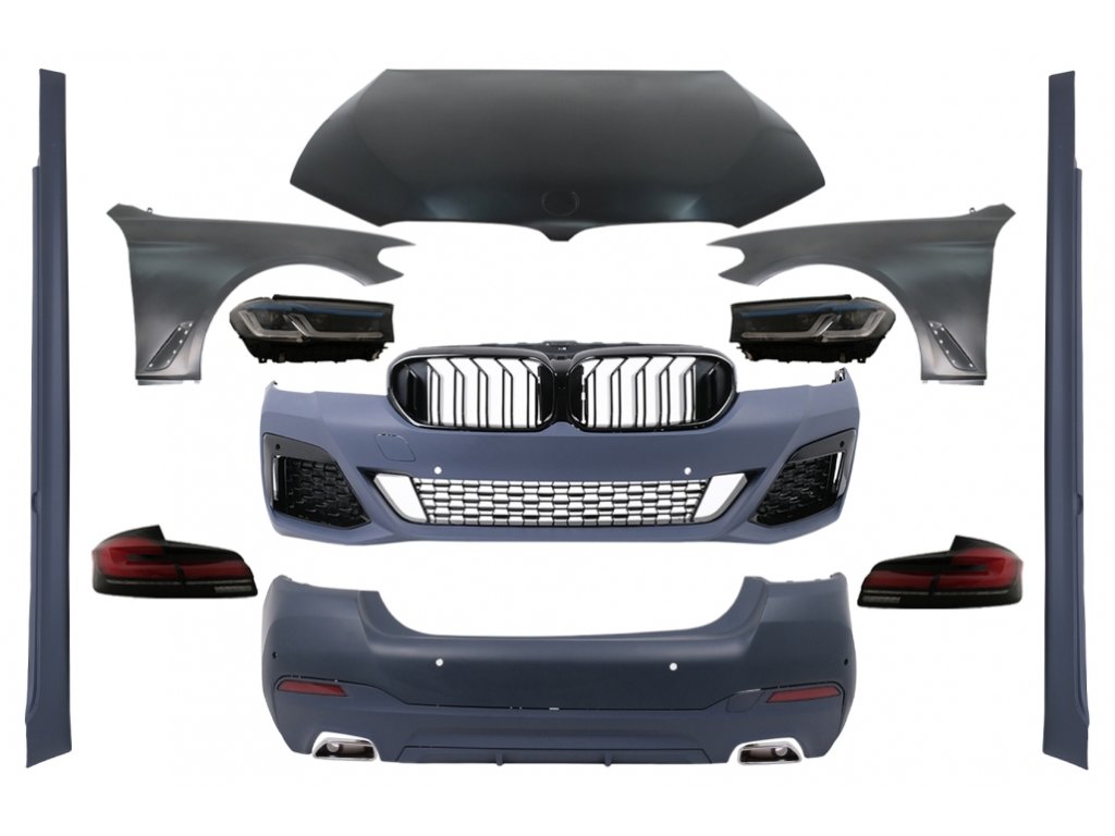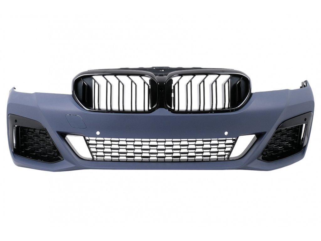 Complete body kit conversion to G30 LCI DesignFront Bumper is equipped with central-lower and side grilles, and parking sensor holders (PDC)