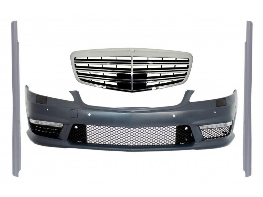 Complete Front Bumper Assembly with Central Grille suitable for Mercedes S-Class W221 (2005-2010) S63 S65 Design and Side Skirts Short Version