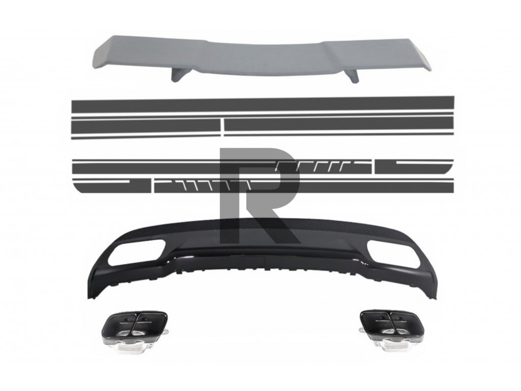 Difúzor, spojler kufra, výfukové koncovky vhodné pre MERCEDES W176 Trieda A 2012+ A-Design s bočnými polepmi, vinylová nálepka, tmavosivá