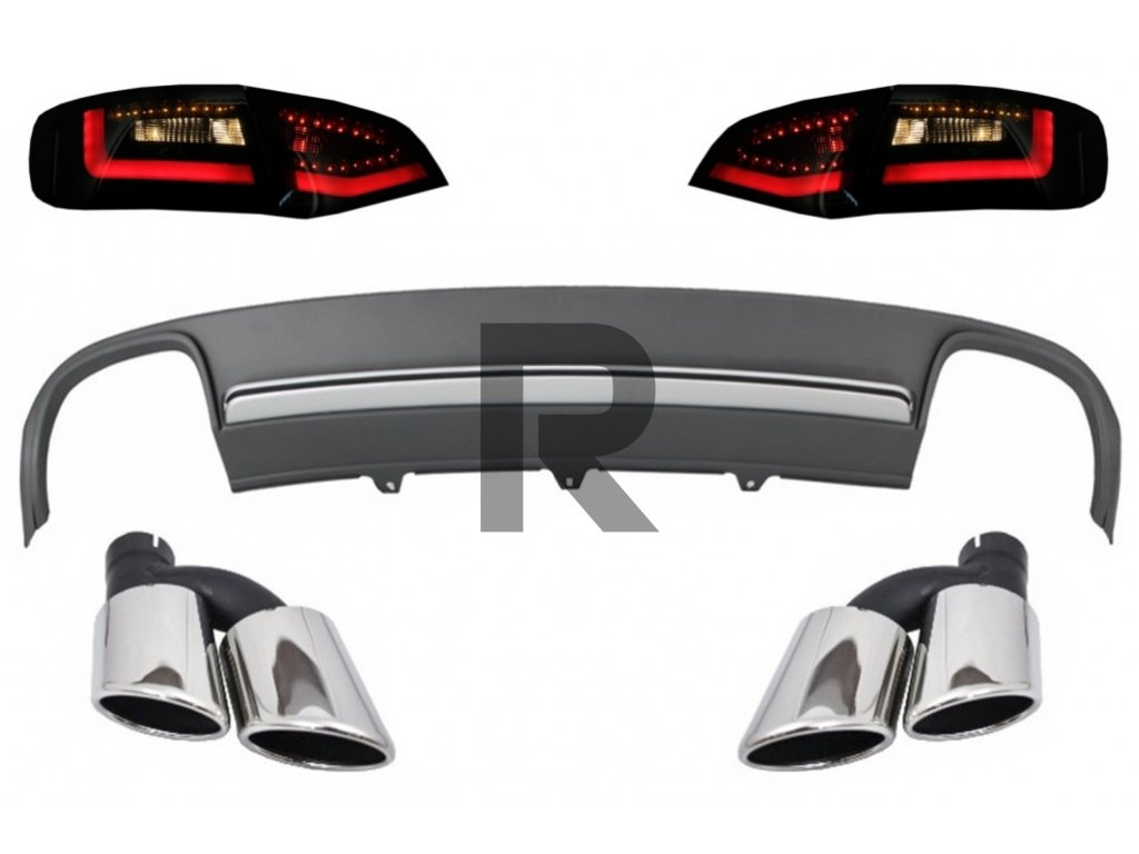 Difúzor a koncovky tlmiča výfuku do zadného nárazníka s LED zadnými svetlami, dynamický čierny/dymový, vhodný pre AUDI A4 B8 8K pred faceliftom, Avant 2008-2011, S4 Design