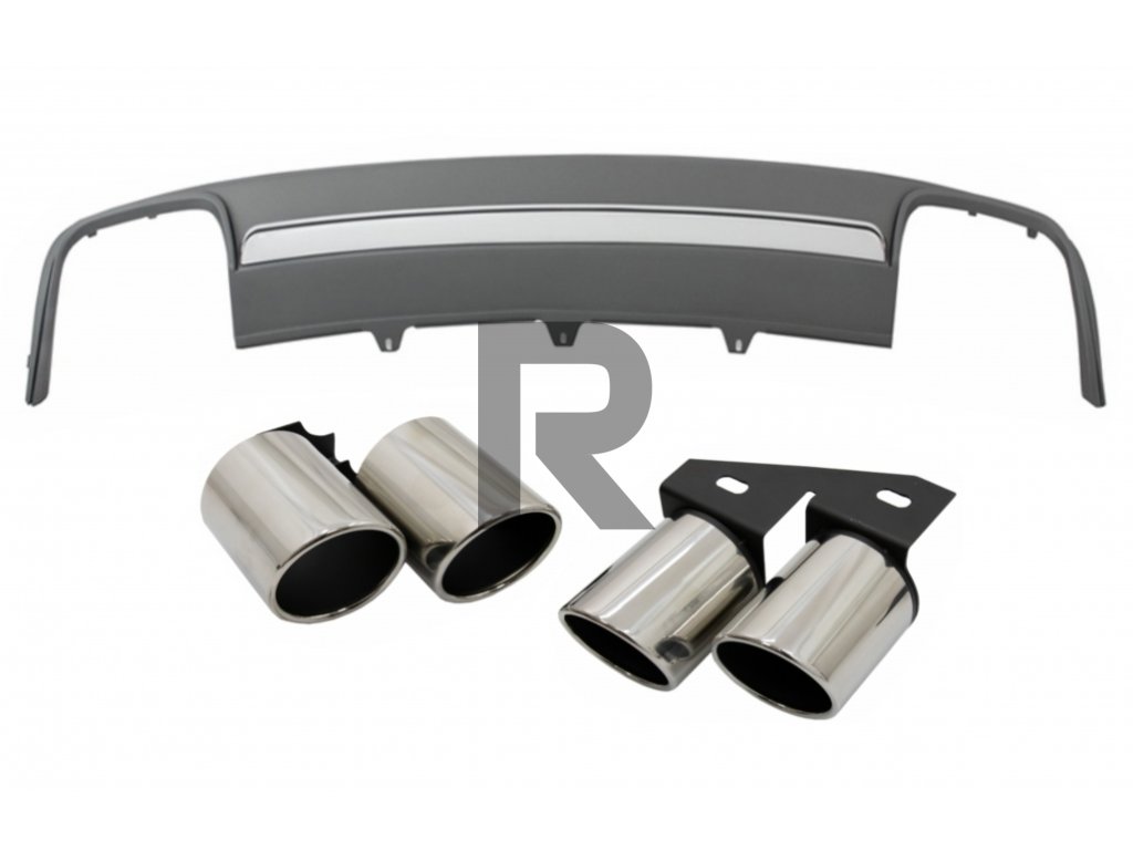 Difúzor do zadného nárazníka S4 Design vyrobený z vysoko kvalitného ABS plastu, vybavený dvojitými výfukovými otvormi.Koncovky tlmiča výfuku sú vyrobené z vysoko kvalitnej ocele.