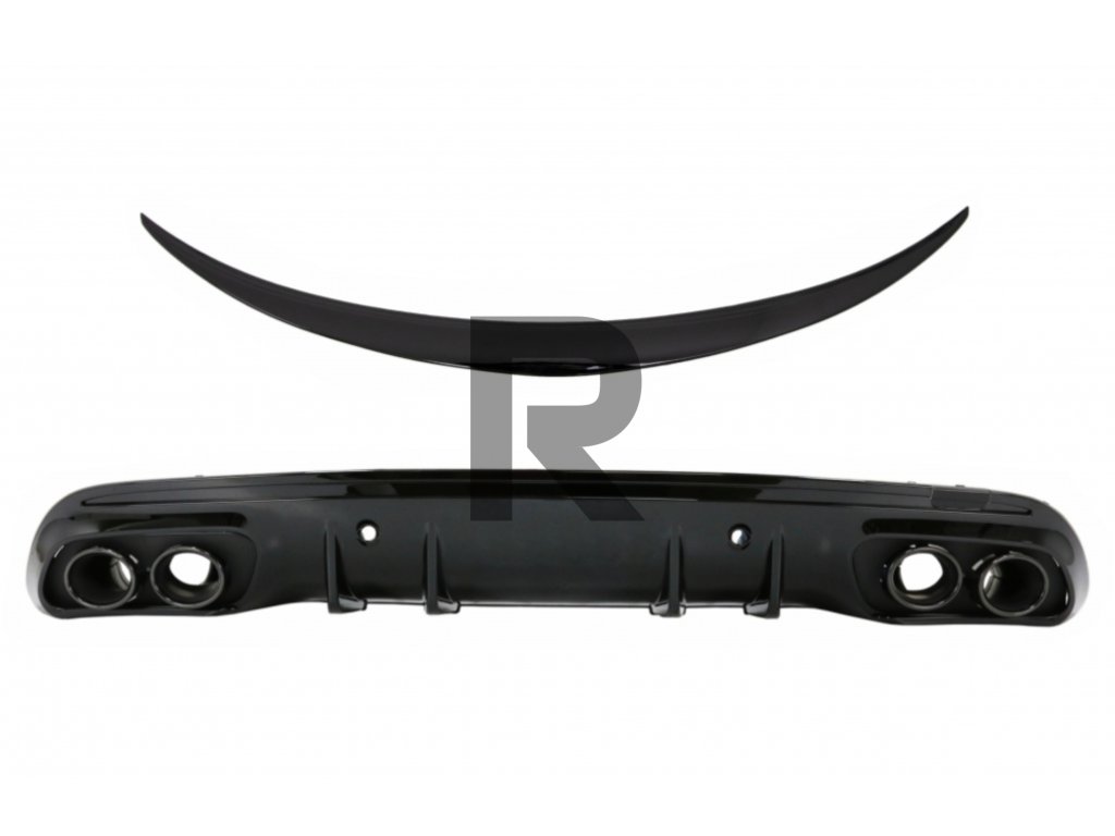 Difúzor zadného nárazníka s koncovkami tlmiča výfuku vhodný pre Mercedes triedy C W205 (2014-2020) a spojler kufra v klavírnej čiernej farbe.