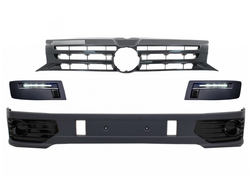 Front Bumper Add-on Spoiler with LED DRL suitable for VW Transporter Multivan Caravelle T5 T5.1 Facelift (2010-2015) and Badgeless Front Debadged Grille Sportline Design