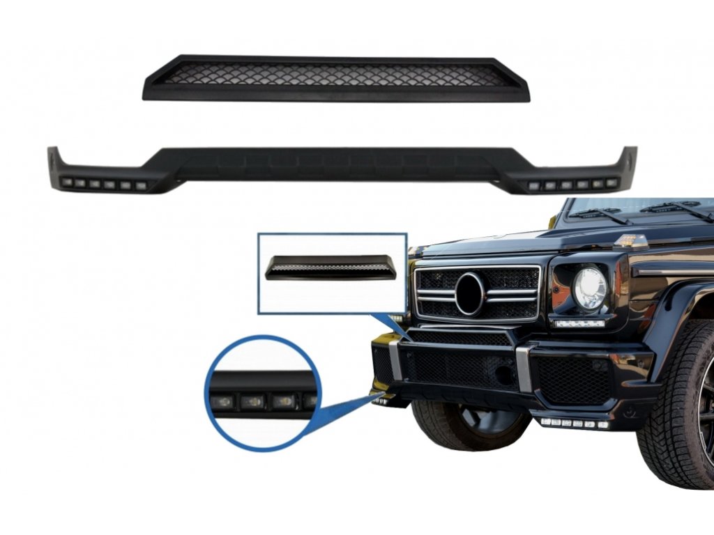 Front Bumper Spoiler LED DRL Extension and Upper Spoiler Lip suitable for Mercedes G-Class W463 (1989-2017) Black