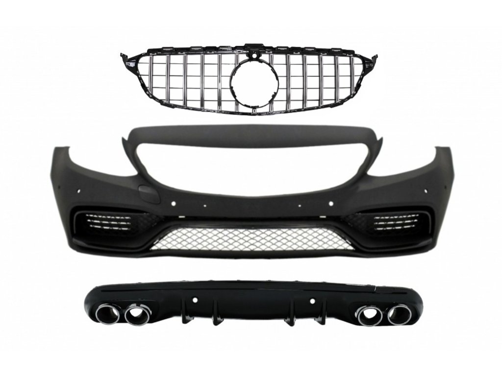 Front Bumper suitable for Mercedes C-Class W205 S205 (2014-2018) Central Grille with Rear Diffuser and Exhaust Muffler Tips C63 Design