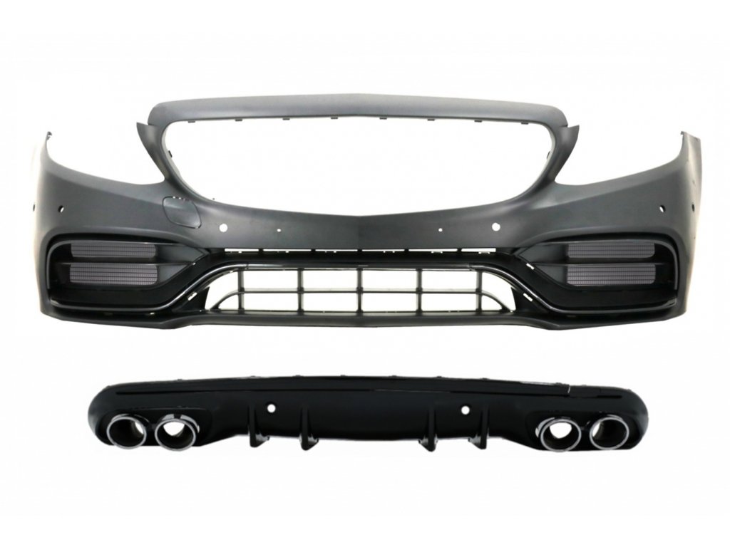 Front Bumper with Diffuser and Exhaust Muffler Tips suitable for Mercedes C-Class W205 Sedan S205 Estate AMG Sport Line (2014-2020) C63 Design