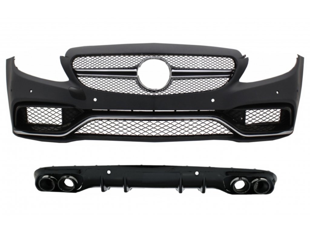 Front Bumper with Diffuser Double Outlet and Exhaust Tips suitable for Mercedes C-Class C205 Coupe A205 Cabriolet (2014-2019) C63 Design