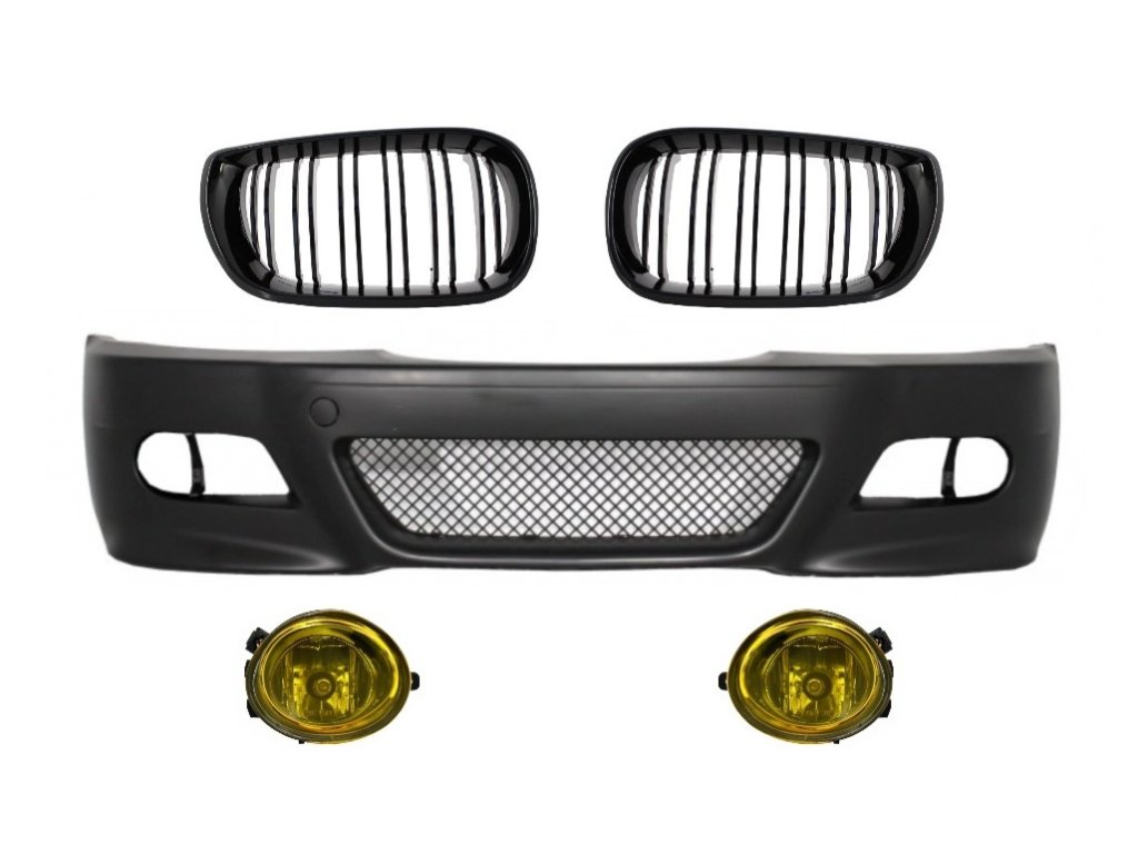 Front Bumper with Fog lights suitable for BMW 3 Series E46 (1998-2004) M3 Look and Central Kidney Grilles Double Stripe M Design Piano Black