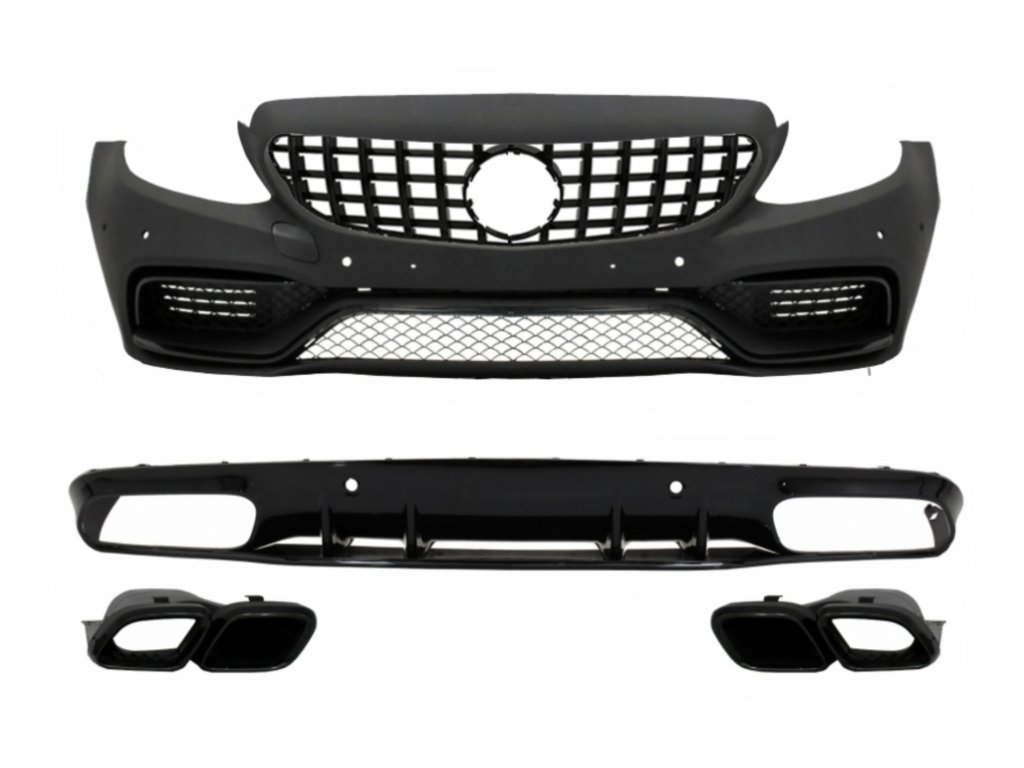 Front Bumper with Front Grille GT-R suitable for Mercedes C-Class C205 A205 Coupe Cabriolet (2014-2019) and Rear Bumper Valance Diffuser C63S Design All Black
