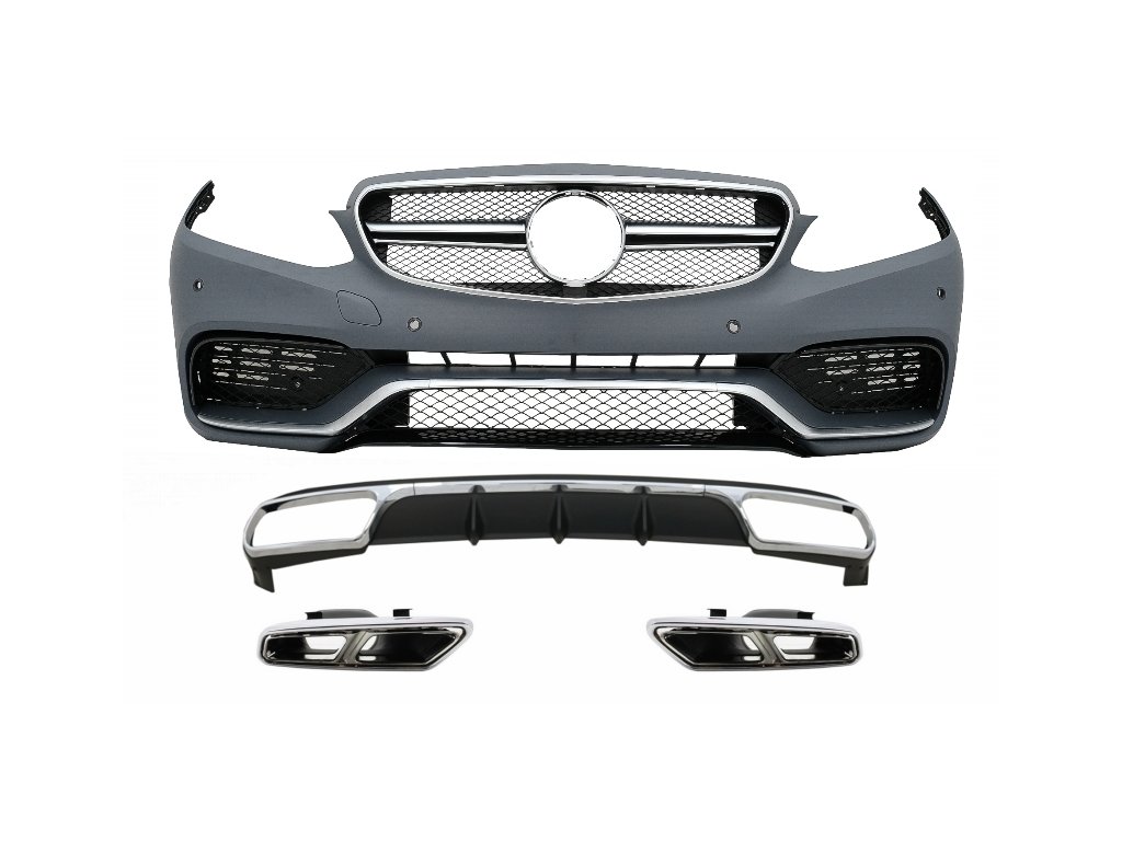 Front Bumper with Rear Diffuser and Exhaust Muffler Tips Chrome suitable for Mercedes E-Class W212 Facelift (2013-2016) E65 Design only Standard Bumper