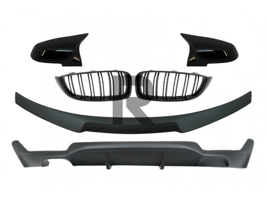 Konverzný balík na M Performance Design centrálne mriežky chladiča so spojlerom kufra a krytmi spätných zrkadiel vhodný pre BMW radu 4 Coupé F32 (2013-up), difúzor vzduchu v matnej čiernej farbe.