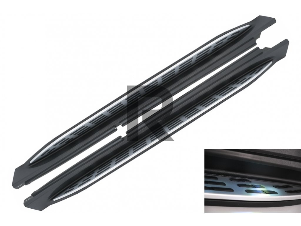 Nástupné plošiny a bočné schodíky vyrobené z vysoko kvalitnej nehrdzavejúcej ocele, hliníka a PVC. Tieto bočné schodíky sú vybavené LED systémom osvetlenia.Bočné schodíky sú k dispozícii aj bez LED osvetlenia, kód: RBMBGLEW167