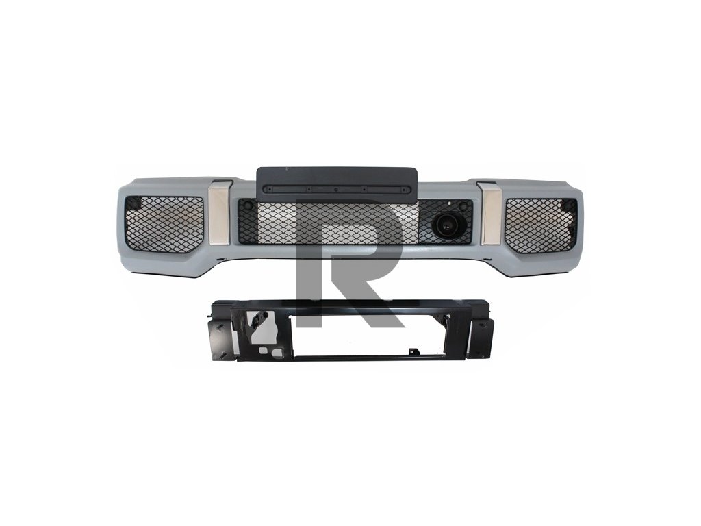 Predný nárazník G65 DesignPredný nárazník je vybavený oceľovou výstuhou predného nárazníka, centrálnou mriežkou chladiča, bočnými mriežkami, hliníkovými ozdobami, mriežkami medzichladiča, atrapou Distronic/Radar senzora a držiakom evidenčného čísla vozidla.