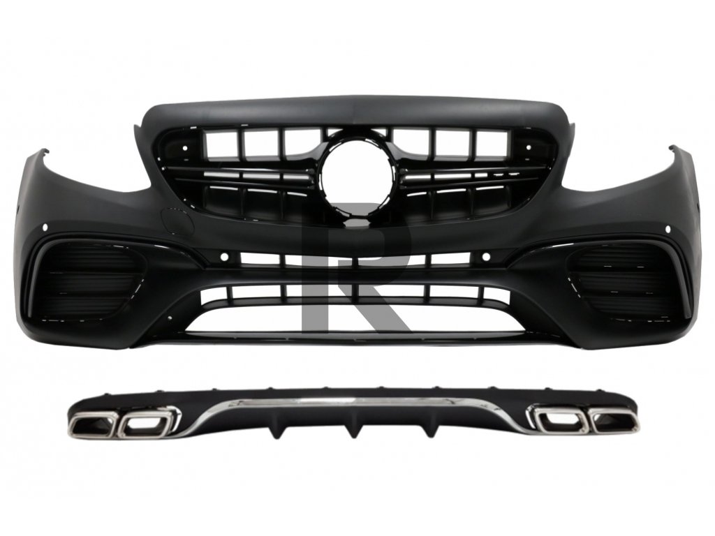 Predný nárazník s difúzorom a koncovkami tlmiča výfuku vhodný pre Mercedes Trieda E W213 S213 Standard (2016-2019) E63 Design čierny chróm