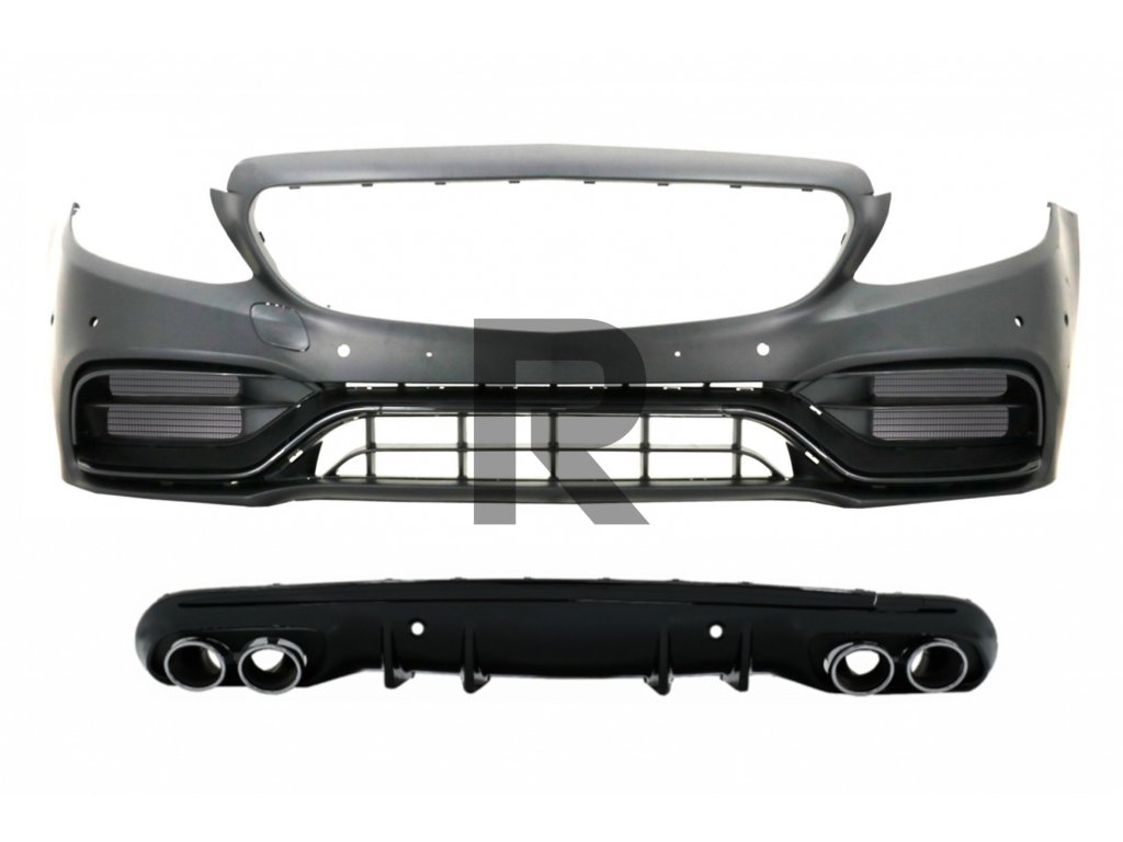 Predný nárazník s difúzorom a koncovkami tlmiča výfuku vhodný pre Mercedes triedy C W205 Sedan S205 AMG Sport Line (2014-2020) C63 Design