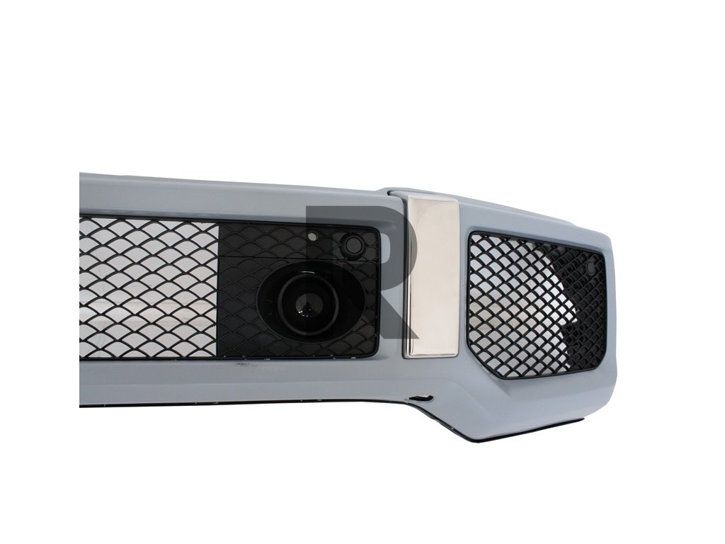 Predný nárazník G65 DesignPredný nárazník je vybavený oceľovou výstuhou predného nárazníka, centrálnou mriežkou chladiča, bočnými mriežkami, hliníkovými ozdobami, mriežkami medzichladiča, atrapou Distronic/Radar senzora a držiakom evidenčného čísla vozidla.