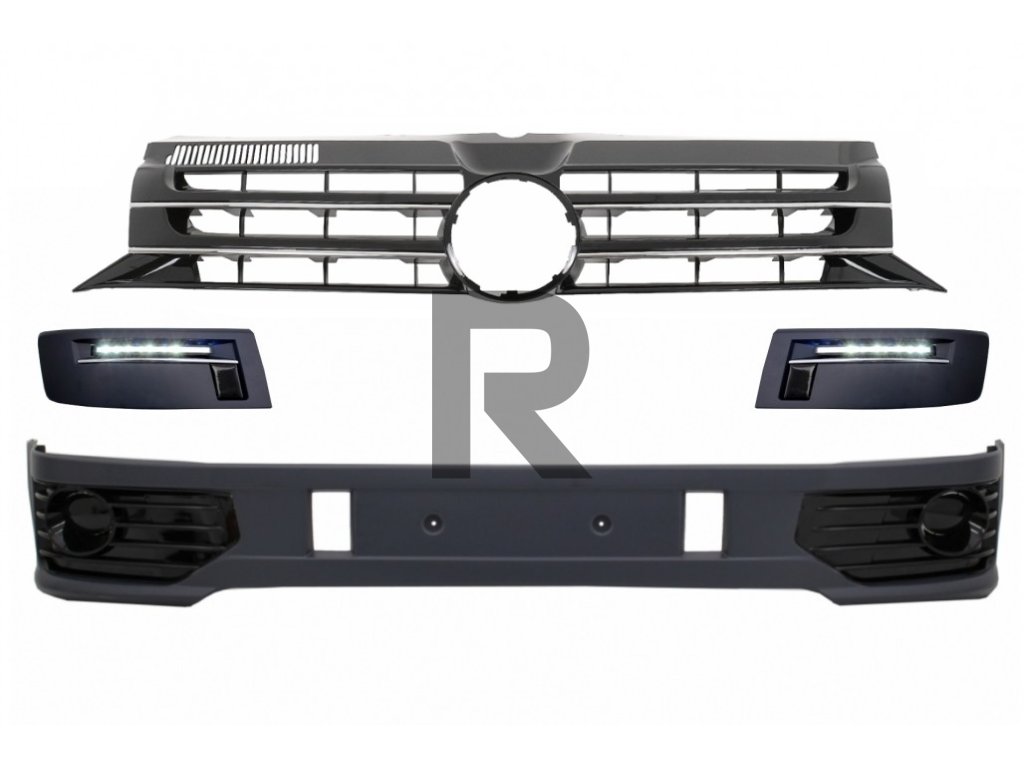 Predný nárazník s LED dennými svetlami vhodný pre VW Transporter Multivan Caravelle T5 T5.1 Facelift (2010-2015) a prednou mriežkou bez loga Sportline Design.