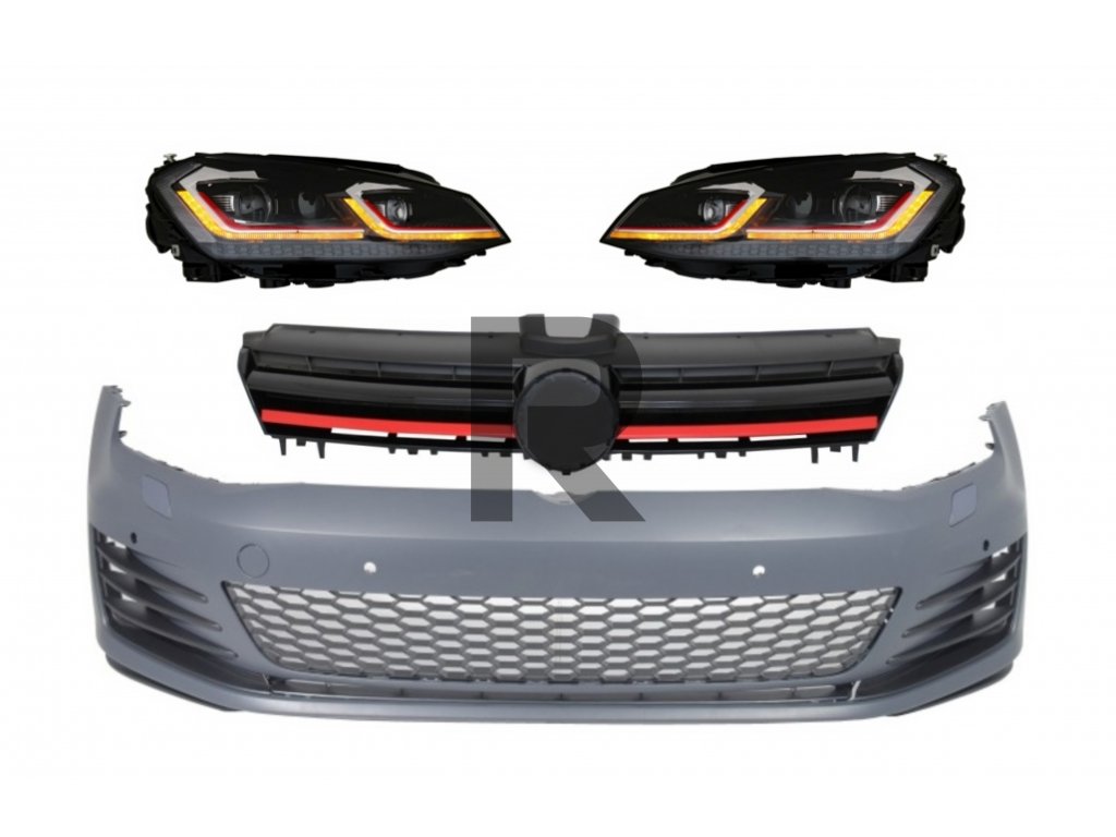 Predný nárazník s LED svetlometmi, sekvenčnými dynamickými smerovými svetlami a červenou mriežkou, vhodný pre VW Golf VII 7 5G (2013-2017) Facelift G7.5 GTI Look