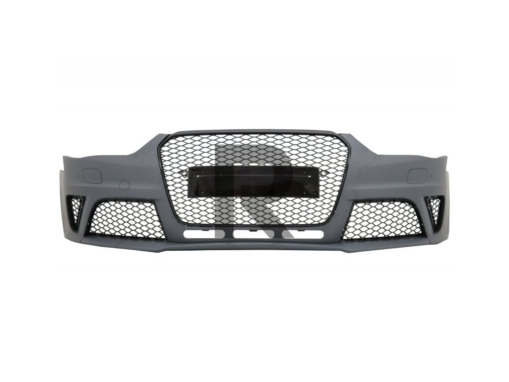 Predný nárazník vyrobený z vysoko kvalitného polypropylénu.Vybavený centrálnou mriežkou chladiča, bočnými mriežkami a predĺženým spodným nárazníkom v dizajne RS4 s včelieho plástu.