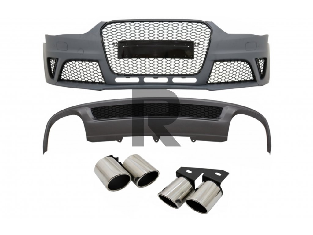 Predný nárazník vhodný pre Audi A4 B8 Facelift (2012-2015) so zadným nárazníkom, difúzorom vzduchu a koncovkami tlmiča výfuku v dizajne RS4.