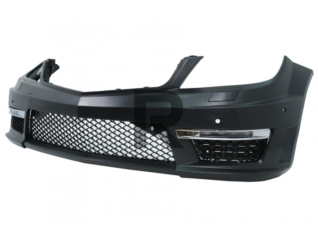Predný nárazník C63 Facelift Look vybavený centrálnou spodnou mriežkou, chrómovanými bočnými mriežkami s dennými svetlami DRL, tryskami ostrekovačov svetlometovNárazník je vyrobený z vysoko kvalitného polypropylénu a je pripravený na lakovanie (základný náter).