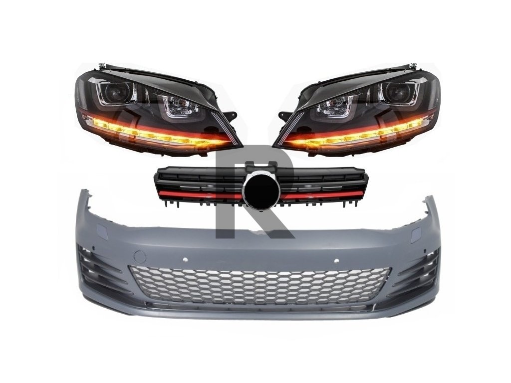 Predný nárazník vhodný pre VW Golf VII, Golf 7 2013-up GTI Look so svetlometmi 3D LED DRL ČERVENÉ, plynulé smerové svetlá a mriežka