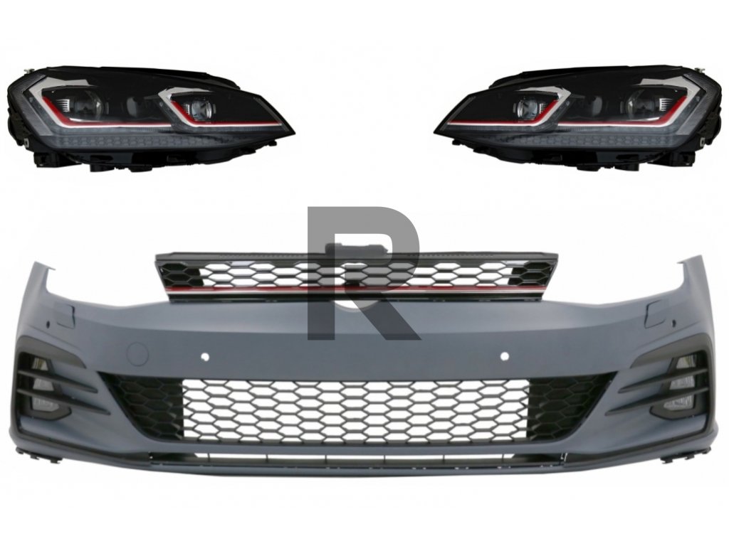 Predný nárazník vhodný pre VW Golf VII 7 (2013-2017) s LED svetlometmi, sekvenčnými dynamickými smerovkami 7.5 GTI Design