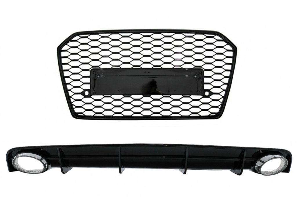 Rear Bumper Valance Diffuser and Exhaust Tips for Audi A6 4G Facelift (2015-2018) with Front Grille RS6 Design Black only S-Line Bumper