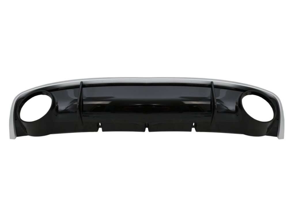 Rear Bumper Air Diffuser crafted in high quality ABS plastic, equipped with double exhaust outlets with 304 stainless steel muffler tips.Finish: Piano Black/ Brushed Aluminum