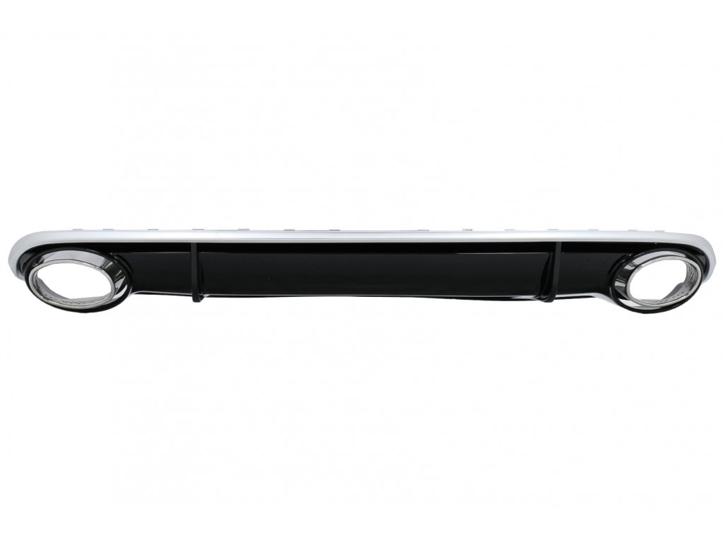 Rear Bumper Air Diffuser crafted in high quality ABS plastic, equipped with double exhaust outlets with 304 stainless steel muffler tips.Finish: Piano Black/ Brushed Aluminum