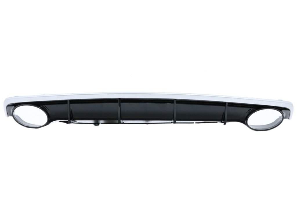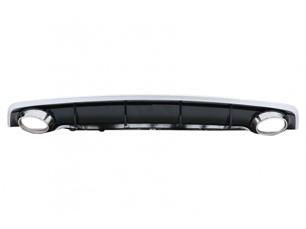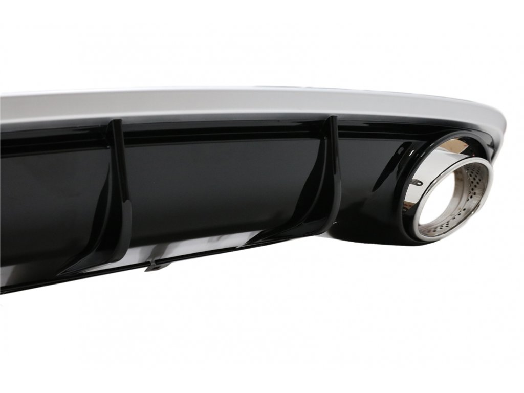 Rear Bumper Air Diffuser crafted in high quality ABS plastic, equipped with double exhaust outlets with 304 stainless steel muffler tips.Finish: Piano Black/ Brushed Aluminum
