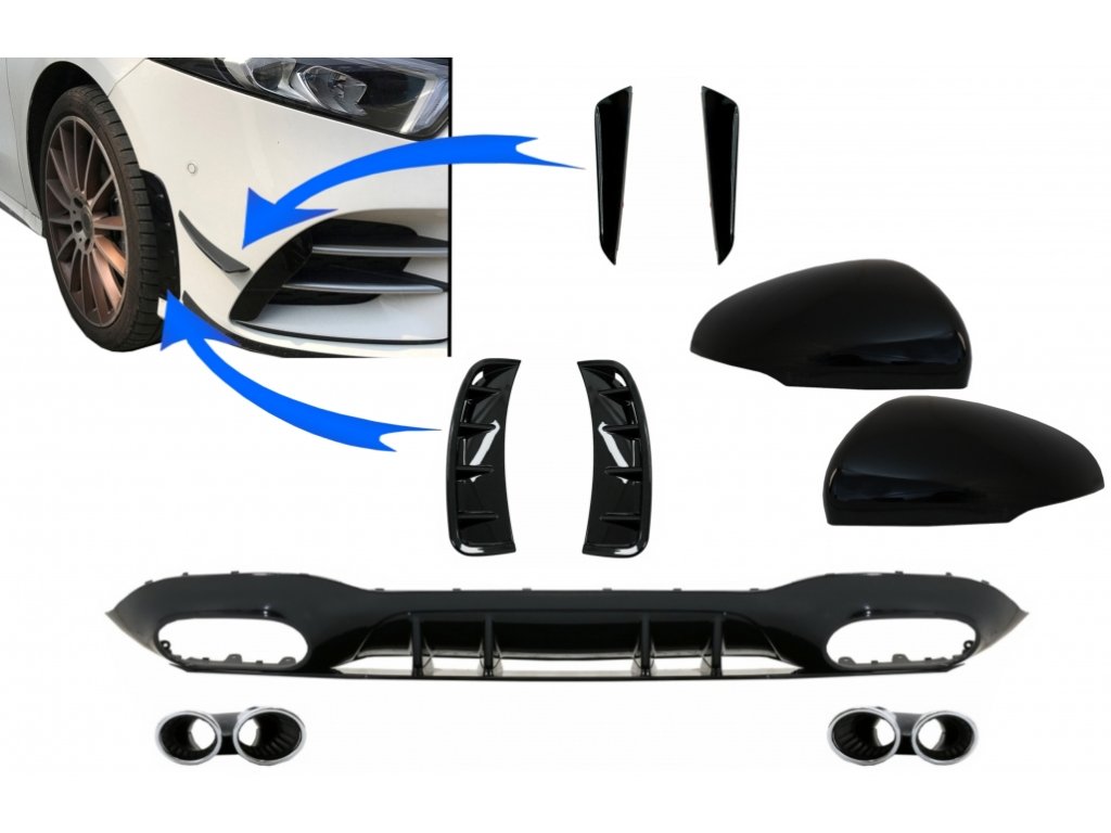 Rear Diffuser with Front Side Vents and Flaps Side Fins & Mirror Cover suitable for Mercedes A-Class V177 Sedan (2018-2022) Chrome Exhaust