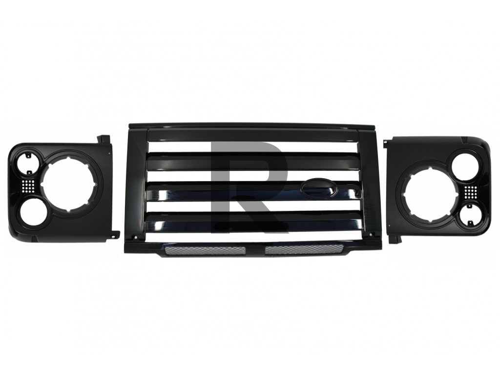 Zostava centrálnej mriežky a krytov svetlometov vhodná pre Land Rover Defender L316 (1990-2016) v klavírnej čiernej farbe